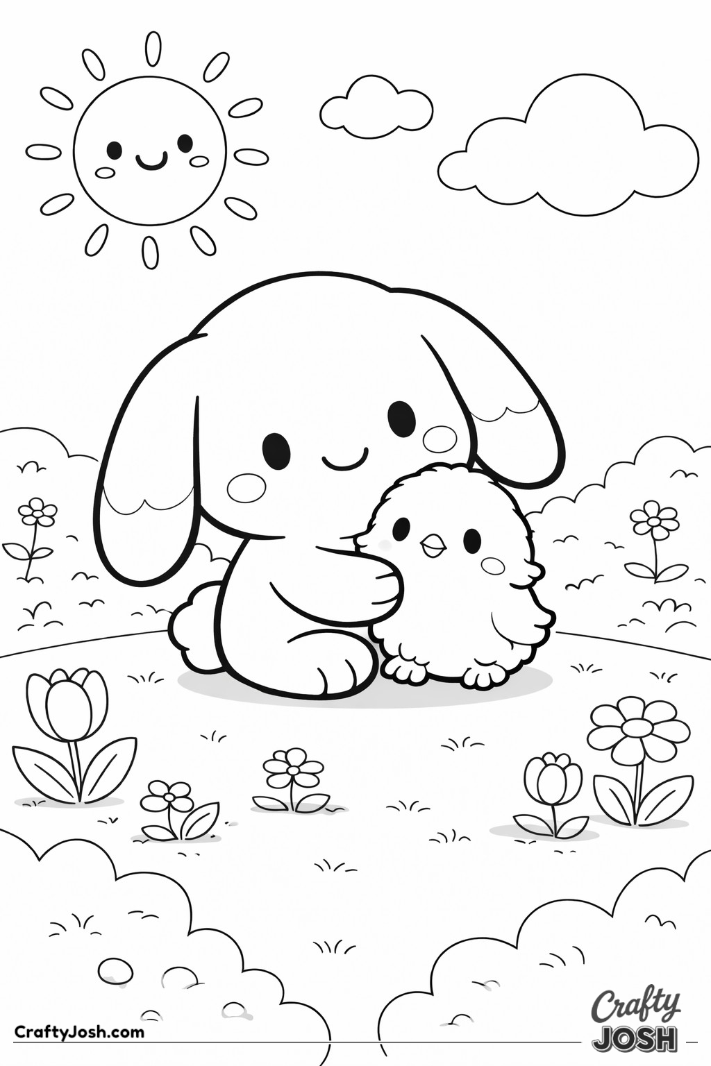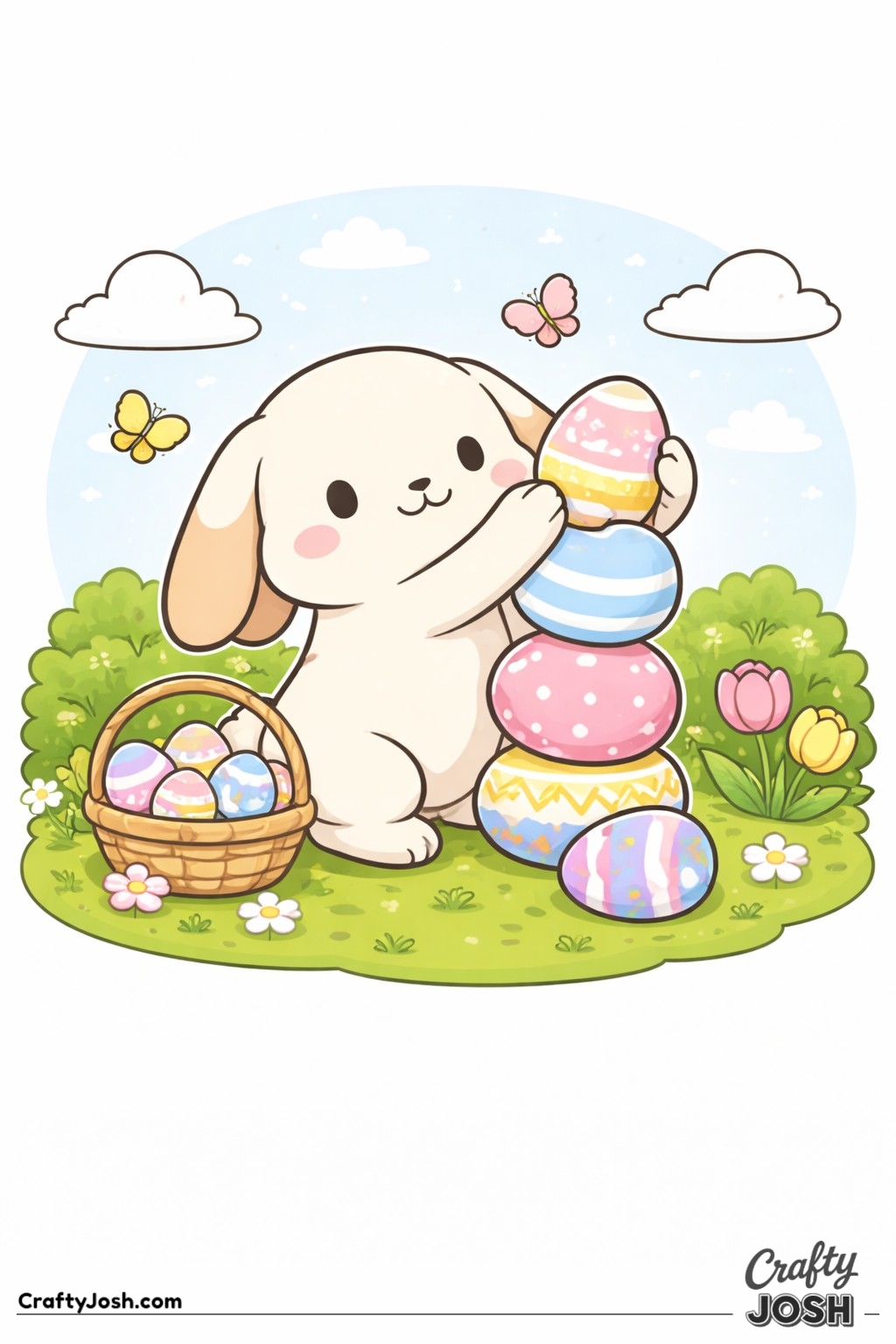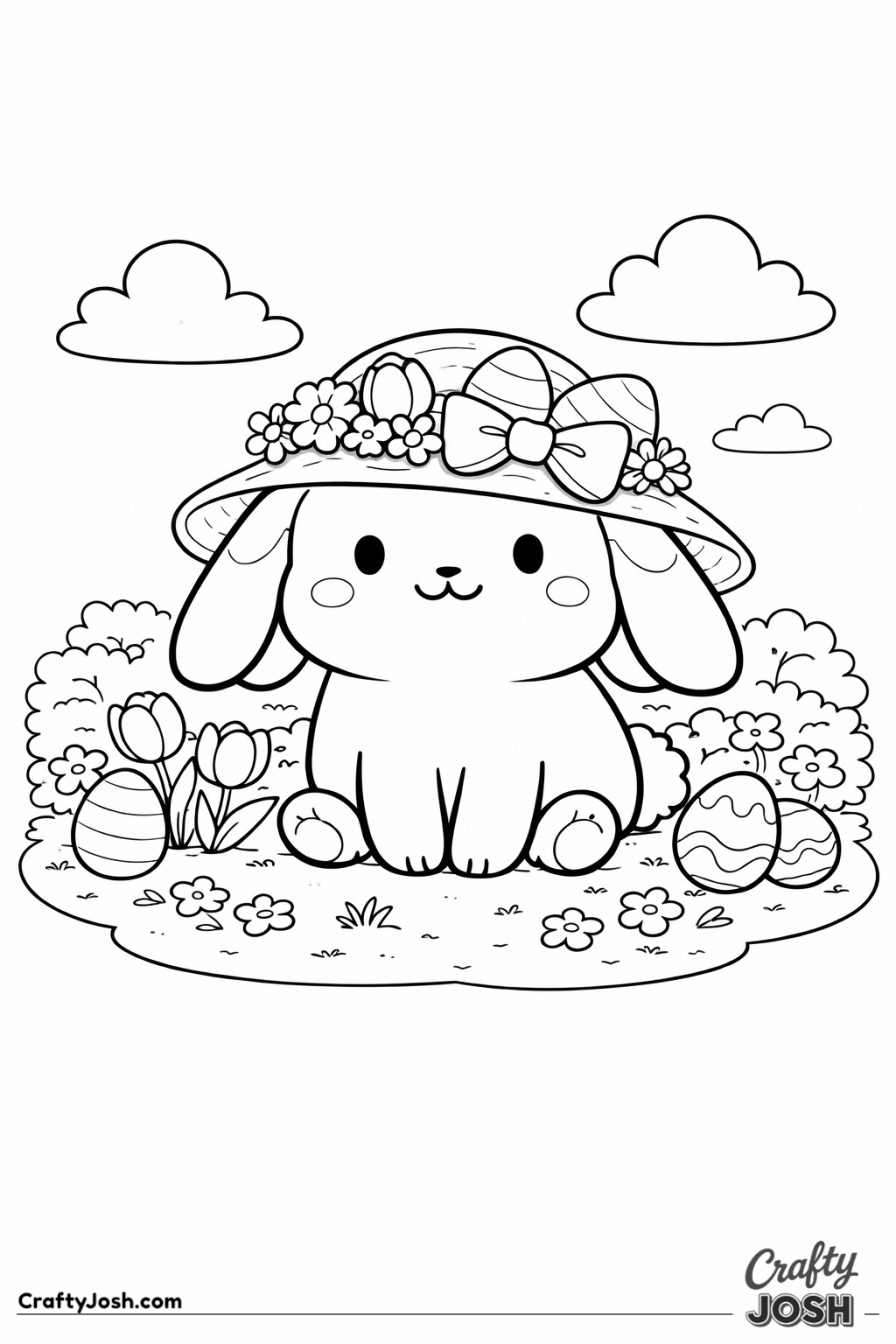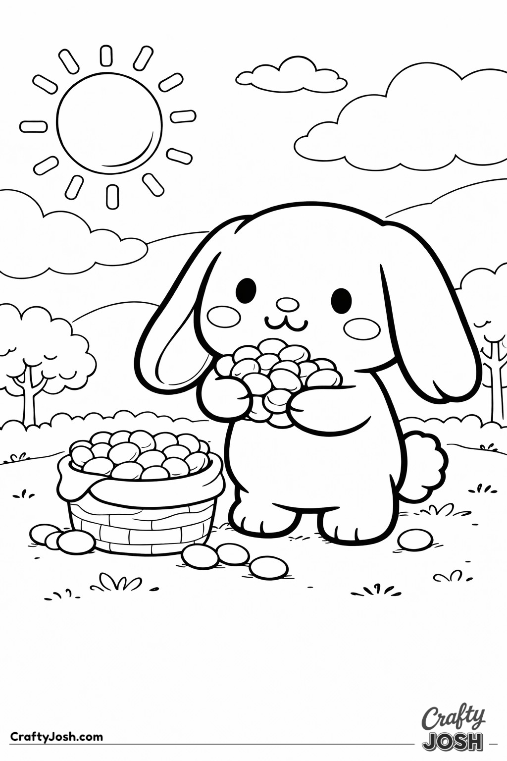 Crafty Josh Easter Bunnies is packed with adorable fluffy friends in the cutest springtime scenes. These cute kawaii bunny designs feature bold outlines, simple shapes, and cheerful details that make them perfect for little kids to color and enjoy.