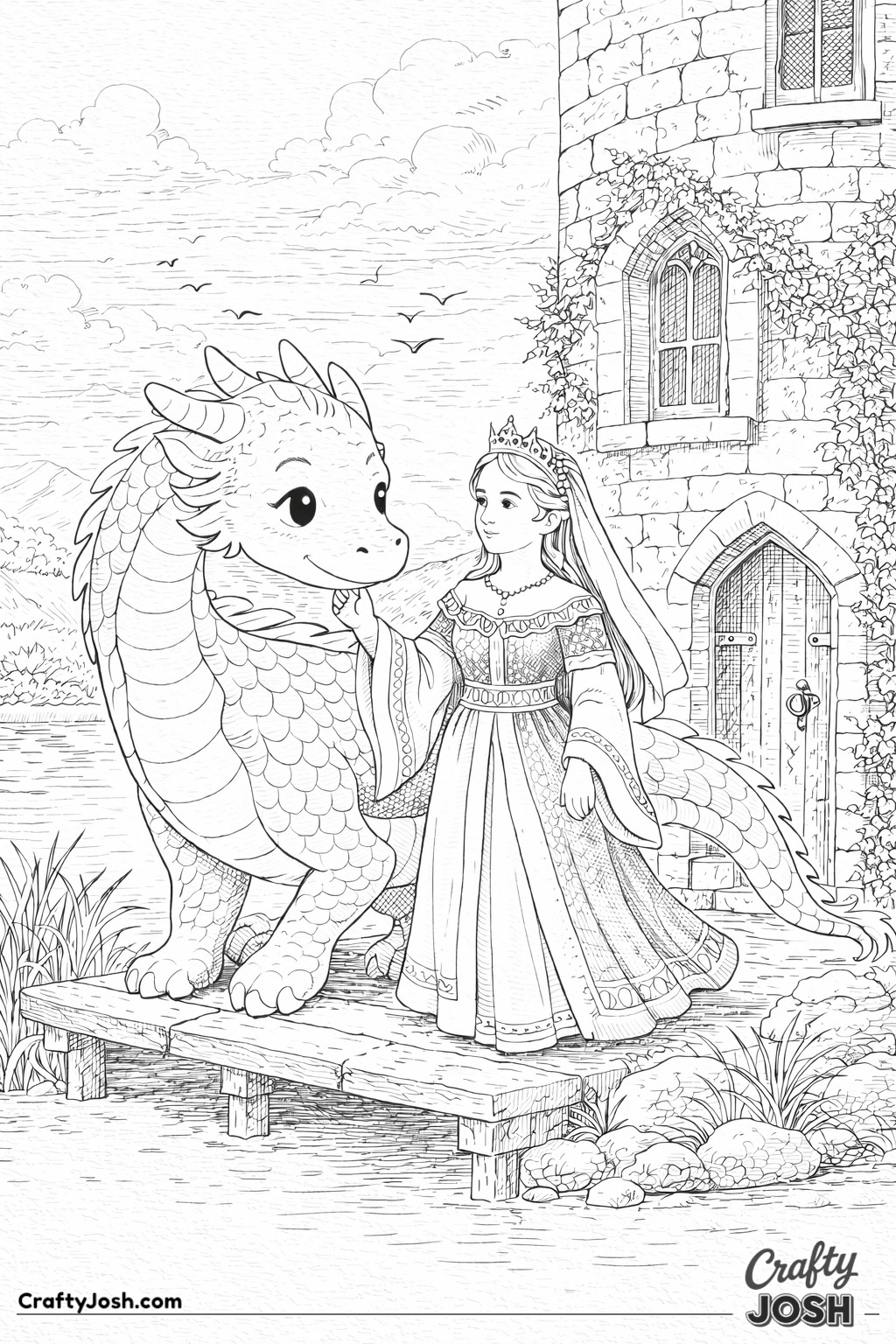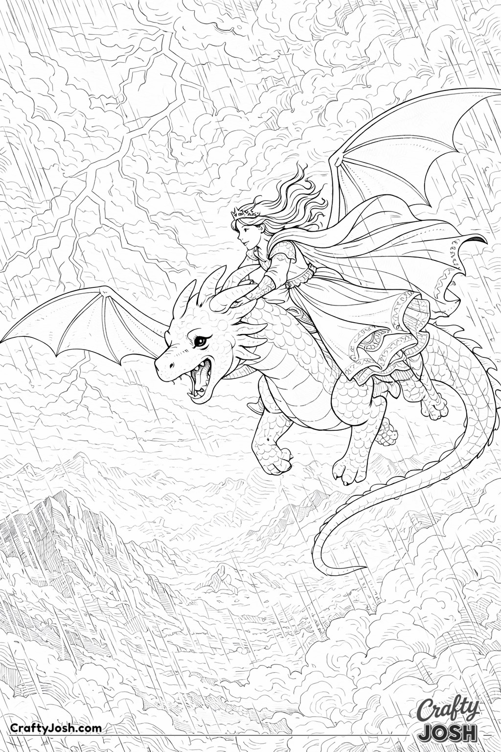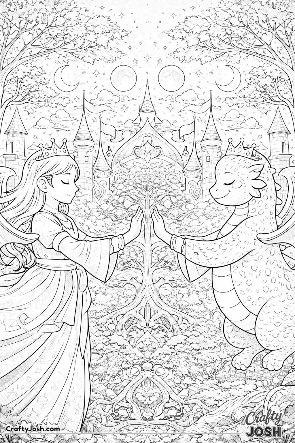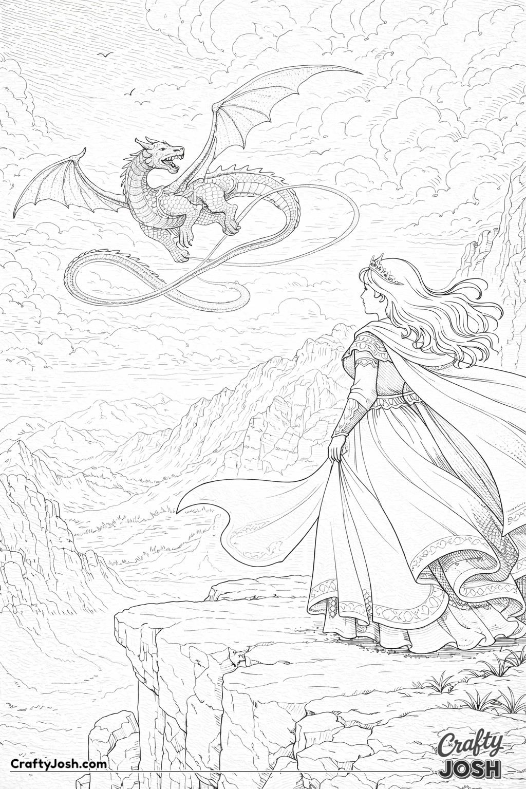 This collection of 20 Detailed Princess and Dragon Realms coloring pages is designed for a more challenging coloring experience while still being fun and relaxing.