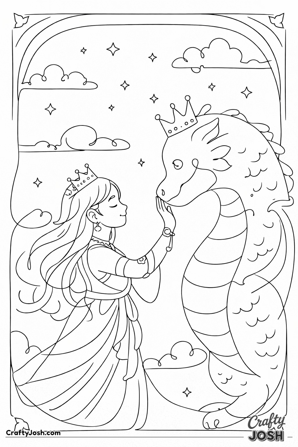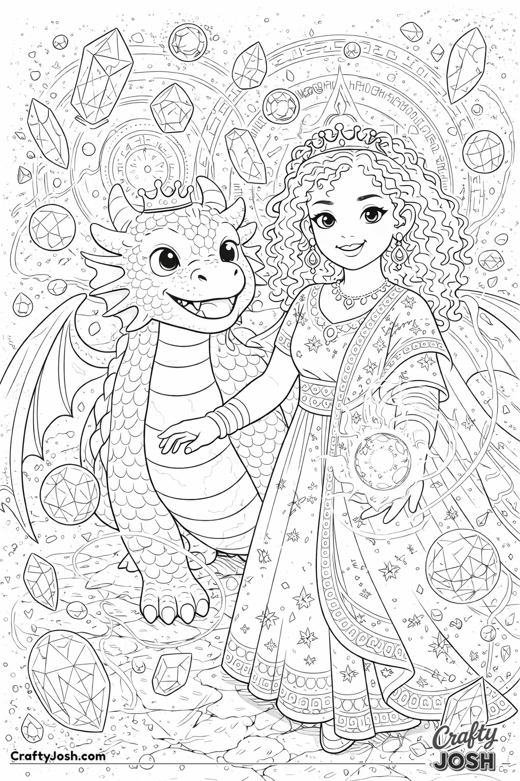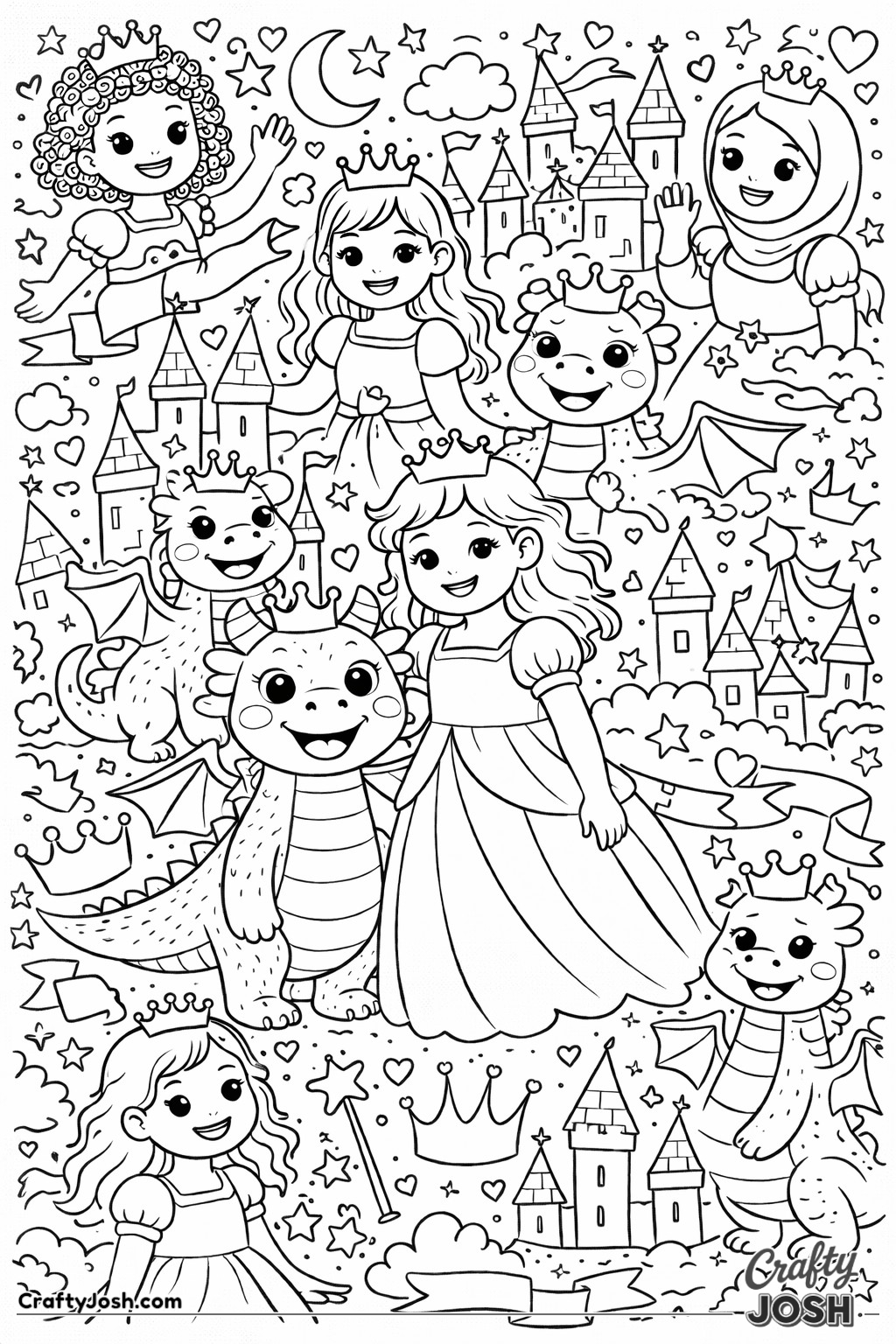 This collection of 20 Detailed Princess and Dragon Realms coloring pages is designed for a more challenging coloring experience while still being fun and relaxing.